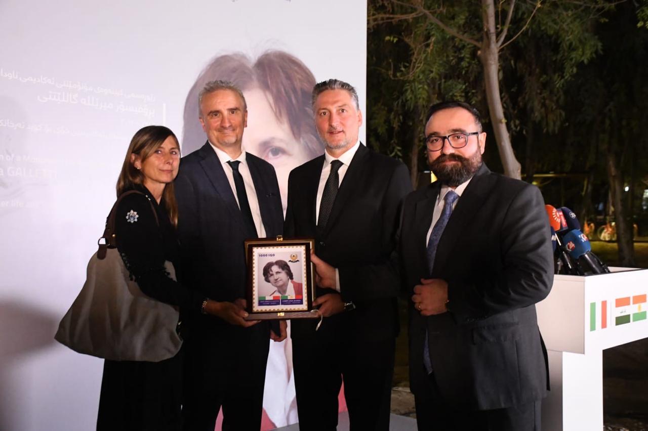 The initiative was spearheaded by Erbil Governor Omed Khoshnaw, in collaboration with and at the suggestion of the Consulate General of Italy. The bronze bust of Professor Galletti was created by Kurdish-Iranian artist Hadi Ziaoddini. In addition to Khoshnaw and Italian Consul Michele Camerota, the event was attended by the Head of the Department of Foreign Relations of the Kurdistan Regional Government, Safeen Dizayee, the Minister of Municipalities and Tourism, Sasan Awmi, and the Deputy Minister of Culture, Arian Salahaddin, who expressed deep appreciation for a friend of the Kurds who had chronicled their history, their sacrifices, and their past sufferings, as well as their customs, traditions, and cuisine. Additionally, the Minister of Transport and Communications, Ano Abdoka, issued a commemorative stamp dedicated to the distinguished Italian.